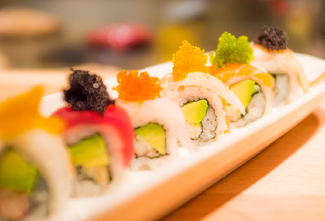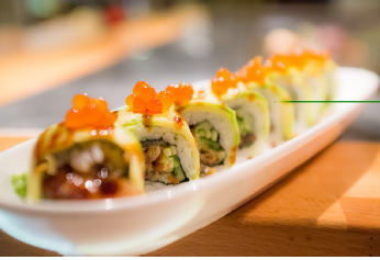 chefs recommendation – king prawn tempura, cucumber, avocado and topped with tobiko